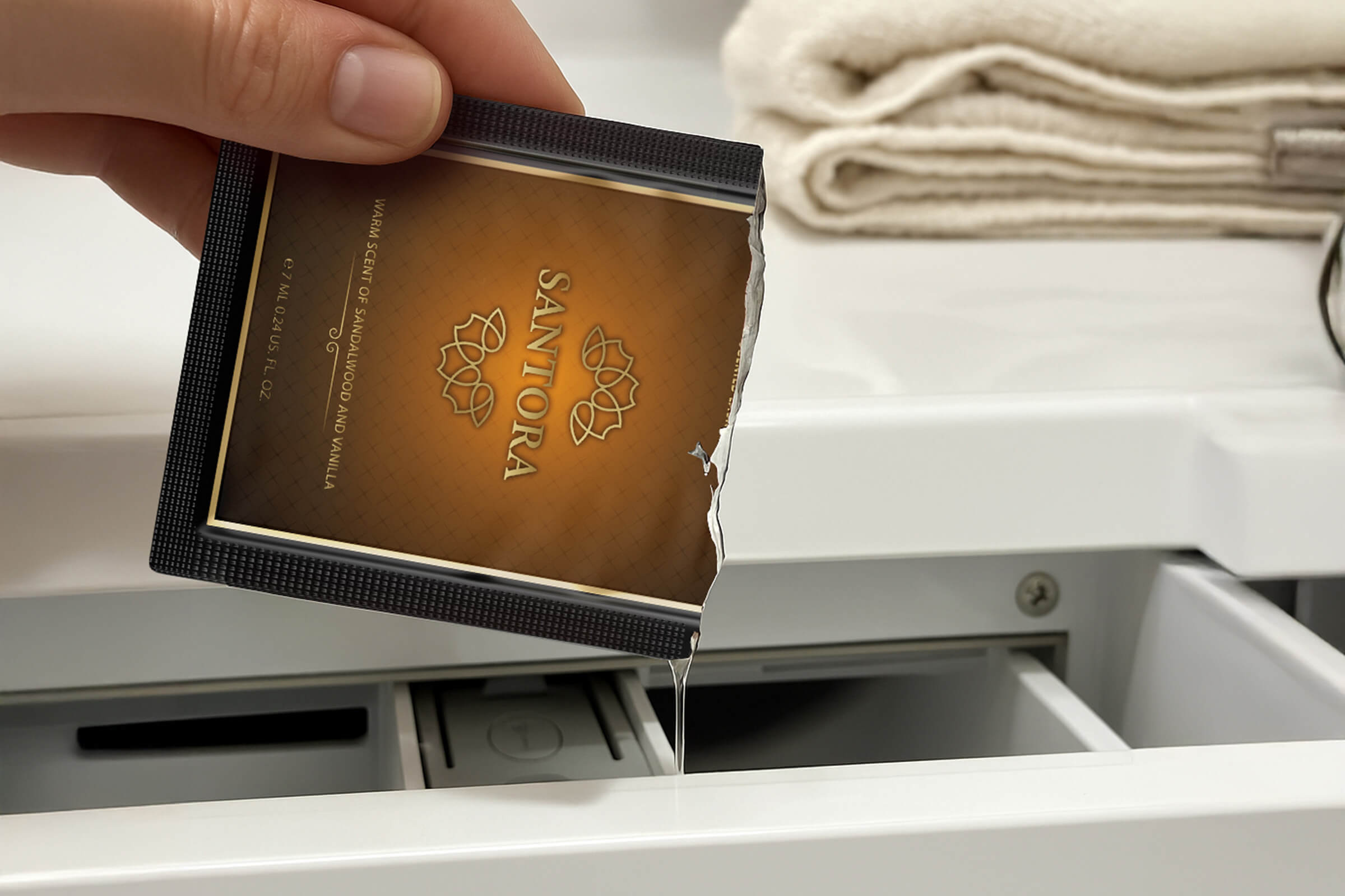 SANTORA je podmanivá vôňa do prania. Po vypraní zanecháva na textíliách sladkú gurmánsku vôňu, zjemnenú balzamickou arómou santalového dreva. Vaše oblečenie či posteľnú bielizeň obalí do hrejivých tónov. Ešte dlho po vypratí z nej ucítite nasladlú a delikátnu orientálnu arómu.